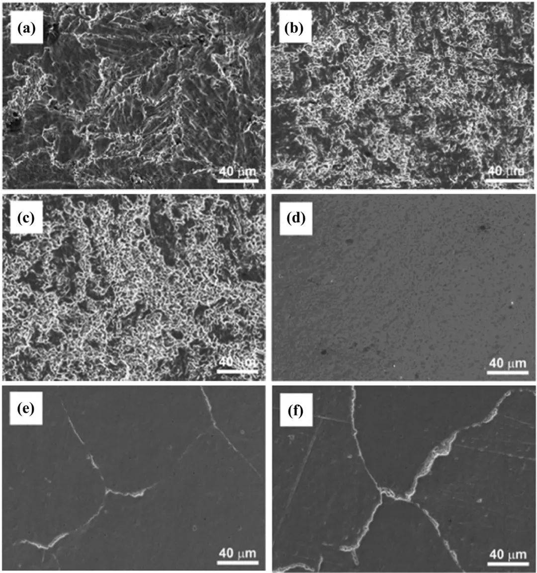圖38 侵蝕表面形貌的SEM圖像;(a) 5小時后基材表面外觀粗糙是由于韌性斷裂造成的;(b) 10小時后,基材表面侵蝕加劇,出現嚴重粗糙化;(c) 15小時后因空化、裂紋、坑洞和嚴重塑性變形而湮滅的表面;(d) AlFeCoCrNi基LC-HEAC在5小時后表面光滑,變形可忽略;(e) 10小時后,LC-HEAC表面在晶界附近開始侵蝕;(f) LC-HEAC表面在15小時后也表現出輕微的塑性變形。