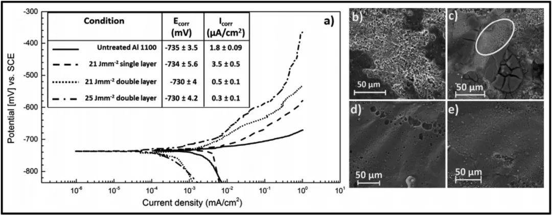 圖36 AlCrCuCoFe基 HEACs腐蝕性能研究(a)不同能量輸入下Al襯底與包層的極化曲線比較;(b) Al襯底的SEM圖像顯示廣泛的點蝕形貌;(c) 21 Jmm?2時單層覆層表面形貌呈腐蝕開裂的SEM圖像;(d) SEM圖像顯示,在21 Jmm?2時,雙包覆層表面形貌較好,有少量凹坑;(e) SEM顯微照片顯示在25jmm?2時,由于基體中相的均勻分布和可以忽略的成分偏析,雙包層具有良好的腐蝕行為。