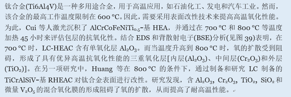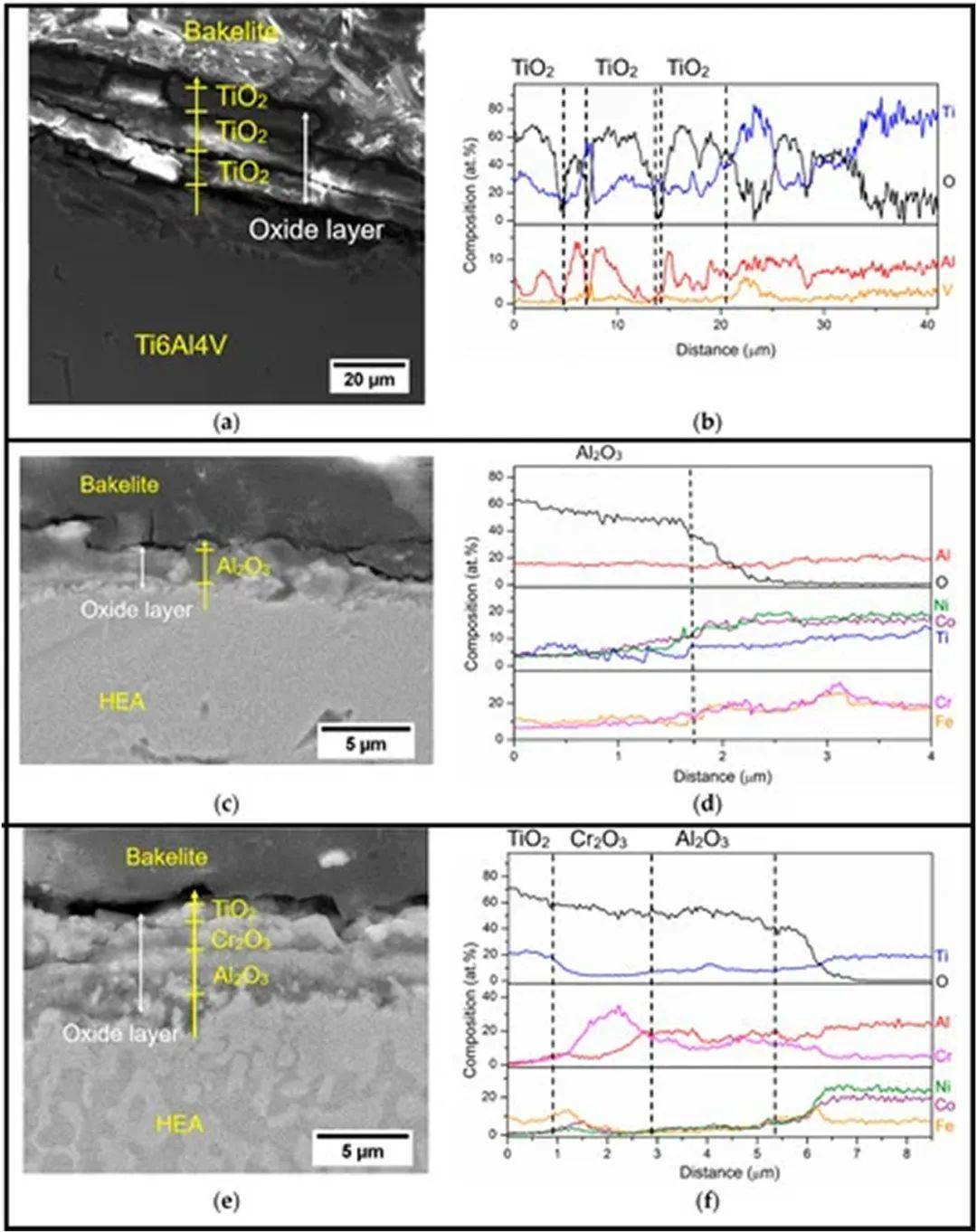 圖39 試樣熱處理45小時后,沿界面進行了BSE截面圖像及相應的EDS分析,以研究其氧化行為;(a) 700°C的鈦基體僅含有TiO2層,且TiO2層易碎,氧化后會脫落;(b) 700°CAlCrCoFeNiTi0.5, Al2O3層;(c) 800°c的AlCrCoFeNiTi0.5由TiO2,Al2O3和Cr2O3組成,其中內層(Al2O3)和中間層(Cr2O3)保護包層不受氧氣擴散的影響。