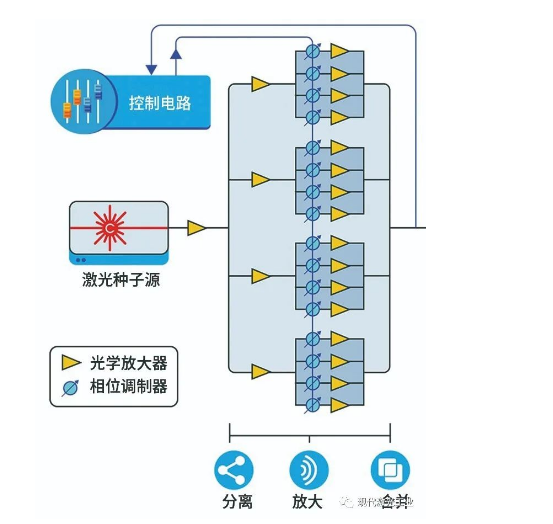 圖3:在動態光束激光器工作期間,來自單種子光纖激光器的光束分裂并通過平行陣列的電光相位調制器,每個調制器驅動一個光放大器