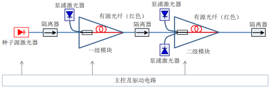 在光纖激光器中,隔離器主要被用來(lái)避免光路中的回波對(duì)光源、泵浦源以及其他發(fā)光器件造成干擾和損傷。以脈沖光纖激光器為例,其主要由種子源激光器、隔離器、泵浦激光器、有源光纖等部件構(gòu)成。隔離器主要用于激光器各級(jí)之間光隔離,使得光脈沖單向傳輸,避免反射光損傷激光器。其中種子源與一級(jí)放大器之間的光纖隔離器用于保護(hù)種子源激光器;一級(jí)與二級(jí)放大器之間的隔離器用于保護(hù)一級(jí)放大器;輸出隔離器為光纖輸入、空間準(zhǔn)直光輸出隔離器,用于將光纖內(nèi)的激光器轉(zhuǎn)換為空間準(zhǔn)直光束輸出,并隔離回返光,保護(hù)二級(jí)放大器。