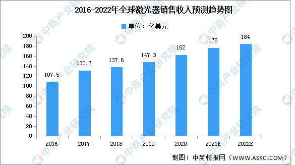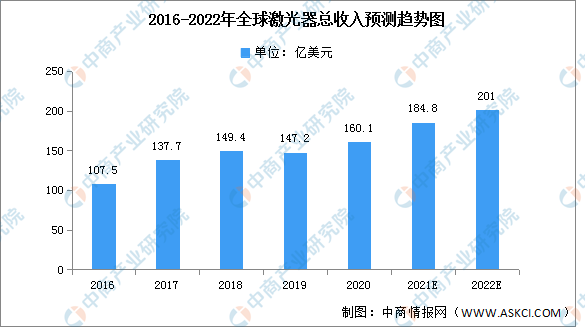 當前,激光工業在全球發展迅猛,現在已廣泛應用于激光智能制造裝備、生物醫學美容、激光顯示、激光雷達、高速光通信、人工智能、機器視覺與傳感、3D識別、激光印刷、科研等領域。2019年,全球激光器銷售收入達147.3億美元,同比增長7.05%。預計2022年,該市場規模將達到184億美元。隨著全球智能化發展,智能設備、消費電子、新能源等領域對激光器的需求不斷增長,以及醫療、美容儀器設備等新興應用領域的持續拓展,全球激光器的市場規模將繼續保持穩定增長。