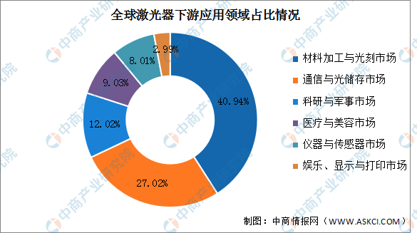激光器的用途十分廣泛,目前可應用于材料加工、通訊、傳感、研發、軍事、醫療等領域。其中材料加工和光刻領域成為全球激光器銷售額占比最大的部分,占比40.94%;通訊與光存儲市場位居第二,占比27.02%;科研和軍事市場居于第三,占比12.02%;隨后是醫療和美容領域,市場份額上升速度明顯,占比9.03%;儀器與傳感器市場占比8.01%;而娛樂、顯示與打印市場排在最后,占比2.99%。
