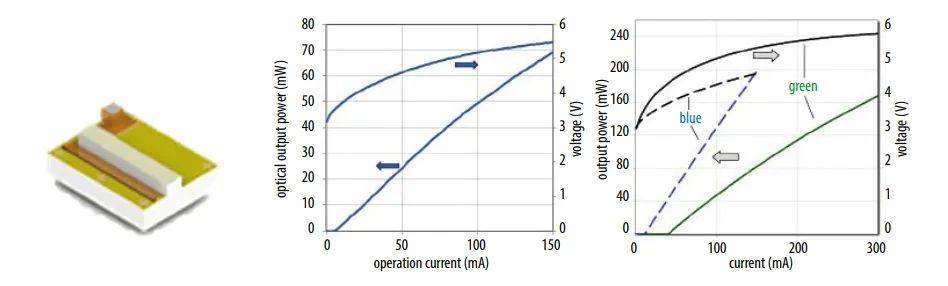 圖2激光二極管示意圖(左),低閾值的LI曲線(中)和大功率單模二極管的LIV曲線。