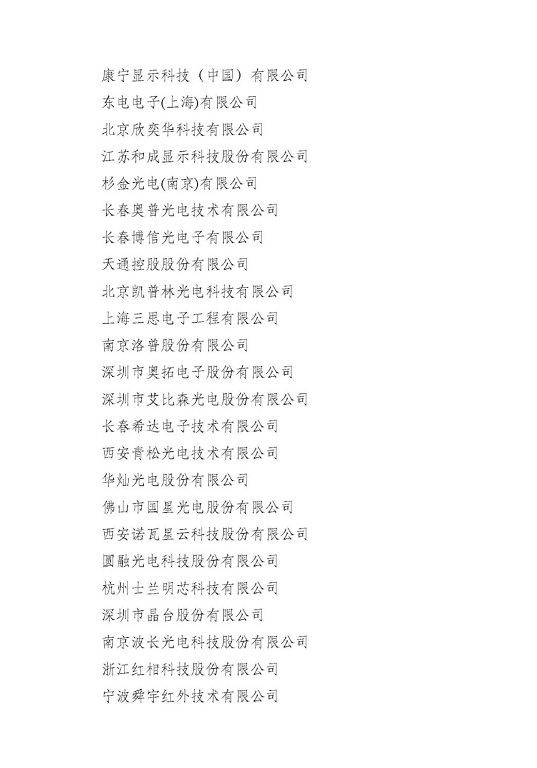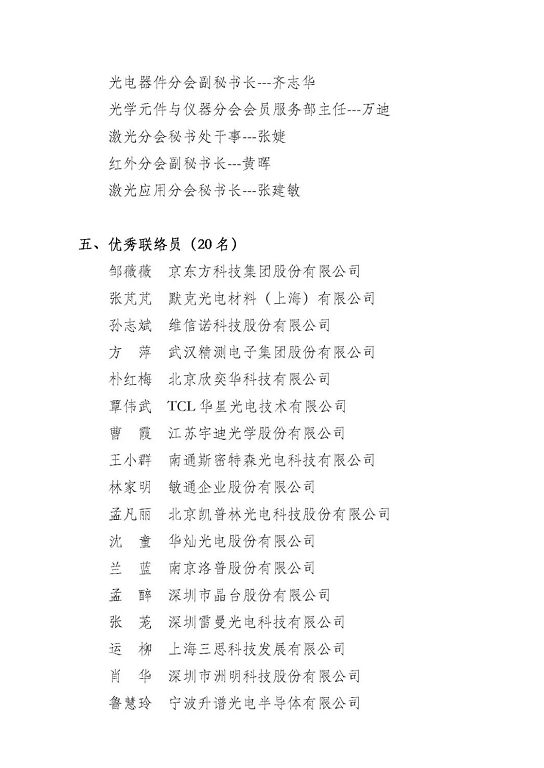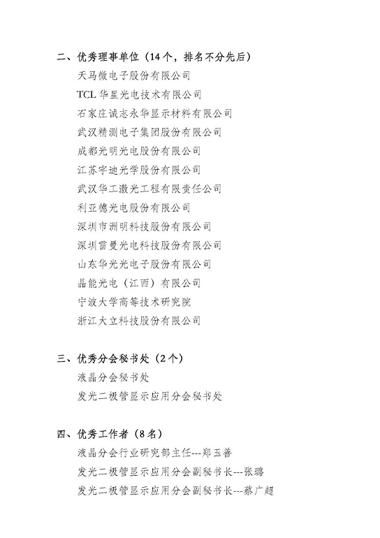 01、優(yōu)秀會(huì)員單位(28個(gè)) 維信諾科技股份有限公司 北京集創(chuàng)北方科技股份有限公司 重慶惠科金渝光電科技有限公司 默克光電材料(上海)有限公司 康寧顯示科技(中國)有限公司 東電電子(上海)有限公司 北京欣奕華科技有限公司 江蘇和成顯示科技股份有限公司 杉金光電(南京)有限公司 長春奧普光電技術(shù)有限公司 長春博信光電子有限公司 天通控股股份有限公司 北京凱普林光電科技有限公司 上海三思電子工程有限公司 南京洛普股份有限公司 深圳市奧拓電子股份有限公司 深圳市艾比森光電股份有限公司 長春希達(dá)電子技術(shù)有限公司 西安青松光電技術(shù)有限公司 華燦光電股份有限公司 佛山市國星光電股份有限公司 西安諾瓦星云科技股份有限公司 圓融光電科技股份有限公司 杭州士蘭明芯科技有限公司 深圳市晶臺(tái)股份有限公司 南京波長光電科技股份有限公司 浙江紅相科技股份有限公司 寧波舜宇紅外技術(shù)有限公司 02、優(yōu)秀理事單位(14個(gè)) 天馬微電子股份有限公司 TCL華星光電技術(shù)有限公司 石家莊誠志永華顯示材料有限公司 武漢精測電子集團(tuán)股份有限公司 成都光明光電股份有限公司 江蘇宇迪光學(xué)股份有限公司 武漢華工激光工程有限責(zé)任公司 利亞德光電股份有限公司 深圳市洲明科技股份有限公司 深圳雷曼光電科技股份有限公司 山東華光光電子股份有限公司 晶能光電(江西)有限公司 寧波大學(xué)高等技術(shù)研究院 浙江大立科技股份有限公司 03、優(yōu)秀分會(huì)秘書處(2個(gè)) 液晶分會(huì)秘書處 發(fā)光二極管顯示應(yīng)用分會(huì)秘書處 04、優(yōu)秀工作者(8名) 液晶分會(huì)行業(yè)研究部主任鄭玉善 發(fā)光二極管顯示應(yīng)用分會(huì)副秘書長張璐 發(fā)光二極管顯示應(yīng)用分會(huì)副秘書長蔡廣超 光電器件分會(huì)副秘書長齊志華 光學(xué)元件與儀器分會(huì)會(huì)員服務(wù)部主任萬迪 激光分會(huì)秘書處干事張婕 紅外分會(huì)副秘書長黃暉 激光應(yīng)用分會(huì)秘書長張建敏 05、優(yōu)秀聯(lián)絡(luò)員(20名) 鄒薇薇 京東方科技集團(tuán)股份有限公司 張芃芃 默克光電材料(上海)有限公司 孫志斌 維信諾科技股份有限公司 方 萍 武漢精測電子集團(tuán)股份有限公司 樸紅梅 北京欣奕華科技有限公司 覃偉武 TCL華星光電技術(shù)有限公司 曹 霞 江蘇宇迪光學(xué)股份有限公司 王小群 南通斯密特森光電科技有限公司 林家明 敏通企業(yè)股份有限公司 孟凡麗 北京凱普林光電科技股份有限公司 沈 童 華燦光電股份有限公司 蘭 藍(lán) 南京洛普股份有限公司 孟 醉 深圳市晶臺(tái)股份有限公司 張 蘢 深圳雷曼光電科技有限公司 運(yùn) 柳 上海三思科技發(fā)展有限公司 肖 華 深圳市洲明科技股份有限公司 魯慧玲 寧波升譜光電半導(dǎo)體有限公司 邵逸愷 北京控制工程研究所 趙克星 昆明云鍺高新技術(shù)有限公司 吳 迪 國家紅外及工業(yè)電熱產(chǎn)品質(zhì)量監(jiān)督檢驗(yàn)中心