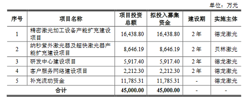 德龍激光本次擬募集資金4.5億元,投向四大項目建設及補充流動資金。