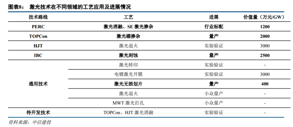 我們判斷,激光工藝一方面能夠在技術(shù)初期幫助光伏企業(yè)建立高壁壘,另一方面也能在紅利擴(kuò)散中助力光伏企業(yè)保持領(lǐng)先,值得重點(diǎn)跟蹤。