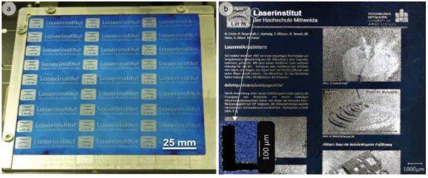 圖4選擇性去除6“硅片(hatch=30μm,Pcw=400 W,v=200 ms-1,w86=40μm)的氮化硅層(Si3N4)。整個硅片的處理時間=20 s(a);分辨率測試。激光打印DIN A4頁面,高度為10 mm(b)