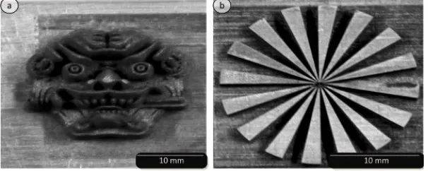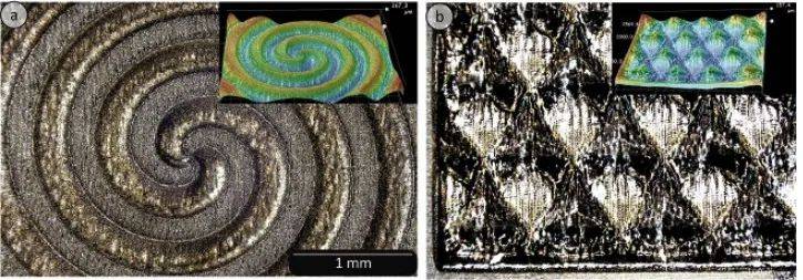 應用多邊形掃描儀的深度映射模式,還可以選擇高功率連續激光作為2.5D高速雕刻的光源。通常情況下,連續波輻射會產生較大的熔池,但快速的掃描速度和由此產生的短交互時間允許在沒有熔融微觀結構的情況下雕刻金屬(圖5a)。