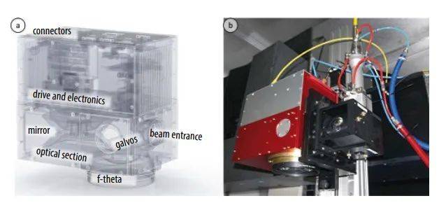 圖1高速二維多邊形掃描儀:掃描儀的原理設置(a)。多邊形掃描儀安裝在加工裝置內,并連接到3kWIPG光纖激光器(b)。