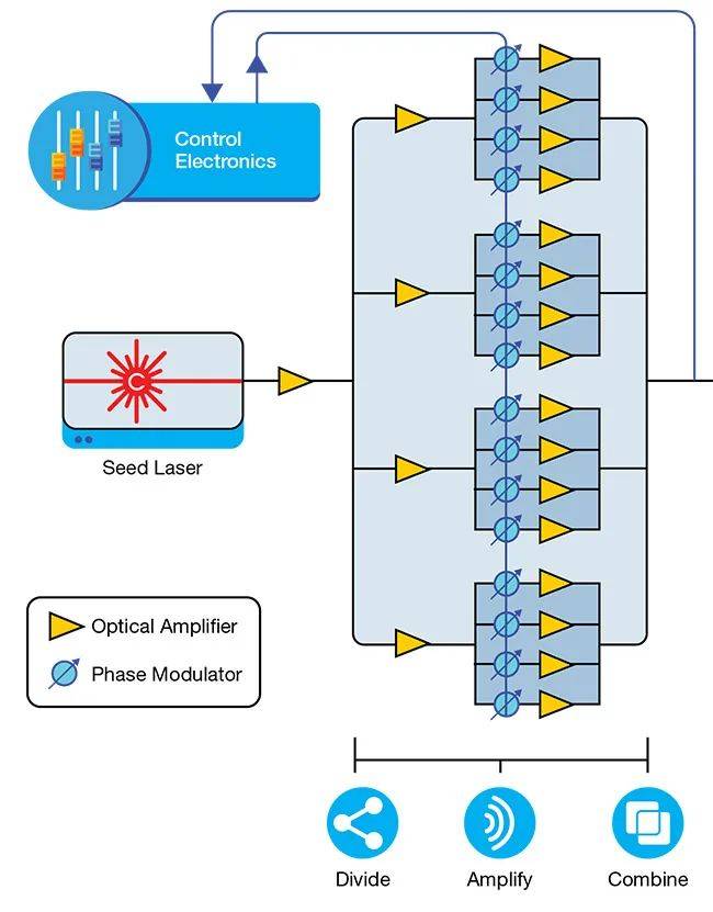 圖3 在動態光學激光調整的運行過程中,從單一種子光纖中處理啊的激光束進行分割并通過一個平行排列的電-光調節器,每一個進行驅動一個光學放大器。