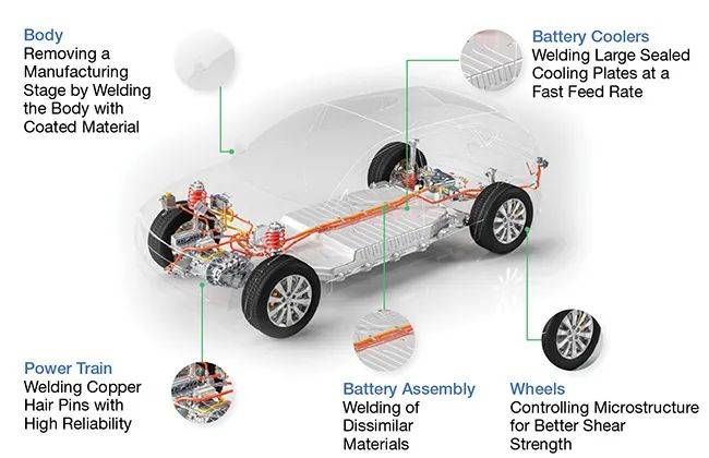圖1 電動汽車的發展對制造商和焊接提出了新的挑戰。除了引入全新的部件和系統之外,電動化還進一步的引入了銅合金和鋁合金等材料的大量應用。激光焊接技術及其裝備使得電動化所需要的成本-效率方面的要求能夠保持同步,但這些工具將得益于光束的巨大的柔性和控制。