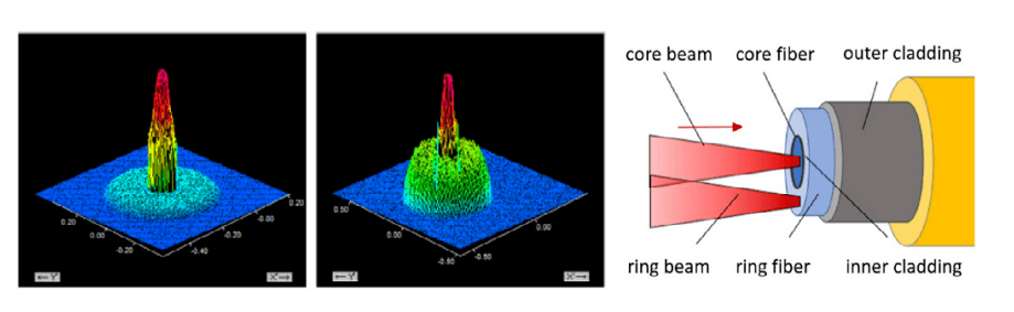 圖1-0 由于將兩個光纖合并到一個光纖中,其中一個作為新的光纖的核心中輸送激光,另外一個分布在新的光纖的環形周圍中,從而形成功率的輸出時,其能量可以改變的結果。這種形狀的激光光束分布可以在焊接的時候很好的防止飛濺的產生。