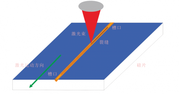 激光無損裂片即是通過激光精確控制加熱與局部輔助冷卻使硅片產(chǎn)生較大溫度梯度,材料產(chǎn)生熱應力到斷裂閾值并產(chǎn)生斷裂,裂縫沿著由激光束路徑引起的熱梯度傳播導致材料完全分開。其核心原理是激光熱應力控制斷裂技術。為了精確控制裂紋走向, 需在電池片首末端分別加工一個超小的槽口,使斷裂擴展從槽口開始至槽口結(jié)束。