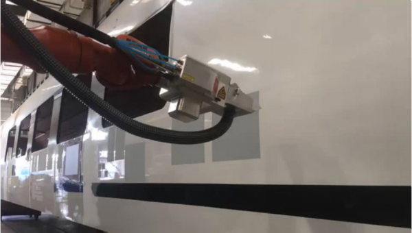 高鐵輪對是機車車輛與鋼軌相接觸的部分,高鐵在運行一段時間后都需要進行檢修。在檢修前,需要將輪軸及輪輻上的涂層徹底剝離下來,涂層為厚度為150-250μm環(huán)氧樹脂涂層材料。傳統(tǒng)的方法是采用鋼絲刷進行打磨,此方法雖然可剝離涂層,但是效率很低,并且作業(yè)人員勞動強度很大,還會對輪對表面造成損傷,以至于對下一步的探傷造成影響。激光清洗技術能有效清除輪對表面漆層,但效率偏低,厚涂層情況下清洗速度慢,局限性很大,而復合激光清洗技術可以將每臺輪對清洗時間控制在8分鐘以內,清洗效率達到Sa3級(清洗最高標準)并無傷基材。
