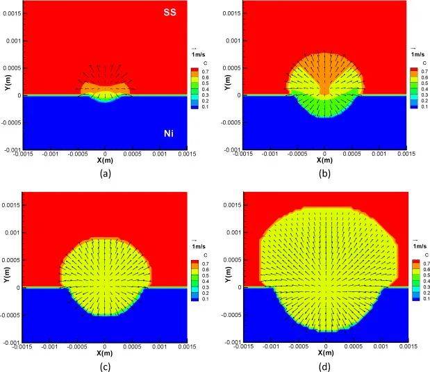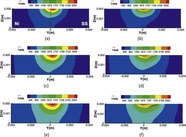 圖3(a–f)顯示了兩種情況下在加熱期間不同時間計算的溫度場和速度場的比較。圖中的輪廓值表示以Kelvin為單位的溫度。黃色和紅色部分代表液體區域。可以看出,在這兩種情況下,遠離熔池的溫度場在不同時間是相似的,這表明了在傳統焊接力學中忽略流體流動和質量傳輸的一些合理性。然而,對于靠近熱源的區域,情況卻截然不同。對于情況1,熔合區更深、更窄,并且具有半球形,這是由于能量僅通過熱傳導從激光束中心徑向傳輸而產生的。峰值溫度總是在304不銹鋼一側,因為其導熱系數遠低于鎳。對于情況2,當考慮流體流動和質量傳輸時,由于最大熱輸入通量,峰值溫度向激光束中心移動。當表面張力的溫度系數為負值時,流體從激光束的中心(表面張力變?。┝飨蛉鄢氐耐鈬?,增強了從熱零件到冷零件的能量傳輸。因此,情況2的峰值溫度遠低于情況1(2423 K vs 3058 K),并且在加熱期間,熔池中的溫度梯度較小。圖4(a–d)顯示了兩種情況在冷卻循環期間計算的溫度場和速度場的比較。在激光器關閉后,情況2的熔池僅保持液態30 ms,而情況1的時間要長得多(約140 ms)。