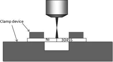 實驗中使用了304不銹鋼和鎳。焊接前用丙酮清潔表面。在一臺具有五軸數控工作站的1kW Nd:YAG激光材料加工系統上進行了實驗。150毫米焦距透鏡用于聚焦激光束。離焦距離為9.5mm,試樣頂面對應的光束半徑為1.0mm。使用650 W的激光功率,相互作用時間為500 ms。圖1顯示了尺寸為20 mm×10 mm×2 mm的304不銹鋼和鎳板的激光點焊示意圖。