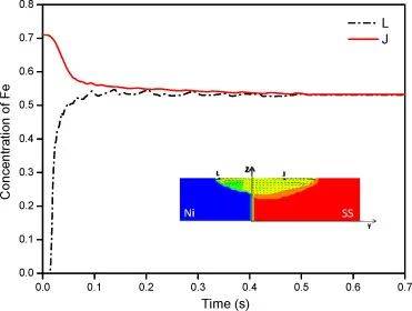 圖8顯示了遠離熱源0.5 mm的兩個位置的鐵濃度變化。如圖所示,熔池形成后,元素快速混合。因此,在熔化的初始階段,不銹鋼側的鐵濃度降低,而鎳側的鐵濃度升高,且速度很快。隨著兩個位置的濃度差減小,質量傳輸變得更加緩慢。因此,在不銹鋼和鎳的激光點焊過程中,兩個位置的濃度差和質量傳輸速度都會隨著時間的推移而減小,直到元素分布變得均勻為止。