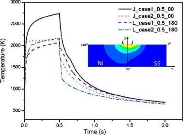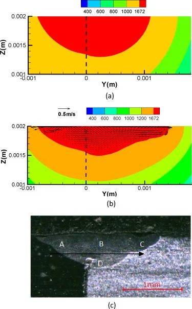 (1)給出了兩種情況下的模擬結果,以說明異種熱電偶激光焊接過程中流體流動對傳熱的重要性。遠離熔池的溫度場不受流體流動的影響。然而,對于靠近熱源的位置,當考慮流體流動時,加熱期間的峰值溫度和溫度梯度都會降低。冷卻速度增加,熔池凝固更快。