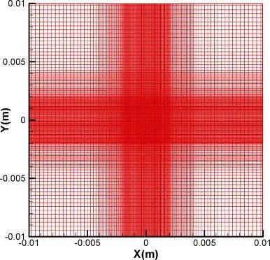 整個矩形計算域被劃分為小的矩形控制體??刂品匠淘诮诲e網格上用控制體積法離散。壓力、溫度、物種濃度等標量存儲在計算單元的中心。速度分量存儲在相應的單元面中心。數值解的一般框架基于SIMPLEC算法。使用159×160×50網格的非均勻網格,在熱源附近使用更細的網格。最小網格間距為20μm。上表面用于數值模擬的網格如圖2所示。