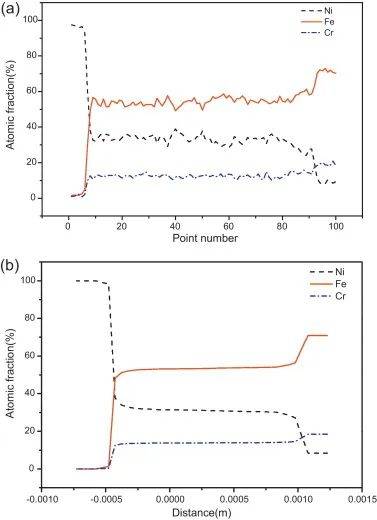 圖10顯示了計算和實驗元素分布的比較。掃描軌跡如圖9(c)所示。計算結果與實驗結果吻合良好,表明了本文數值模型的有效性。通過Marangoni對流和質量擴散,元素在熔池中幾乎均勻分布,根據Fe–Ni二元相圖,凝固過程中的溶質分配不明顯。