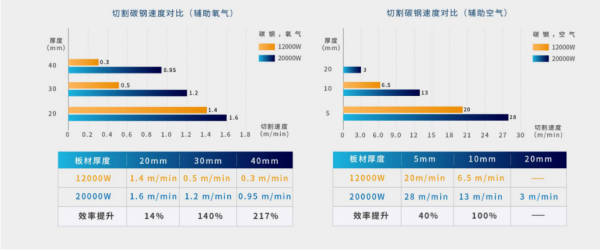 輔助氧氣條件下,在切割30mm和40mm的碳鋼時,20KW的激光切割機優勢非常明顯,切割效率比12KW的分別提升了約1.5倍和2倍。