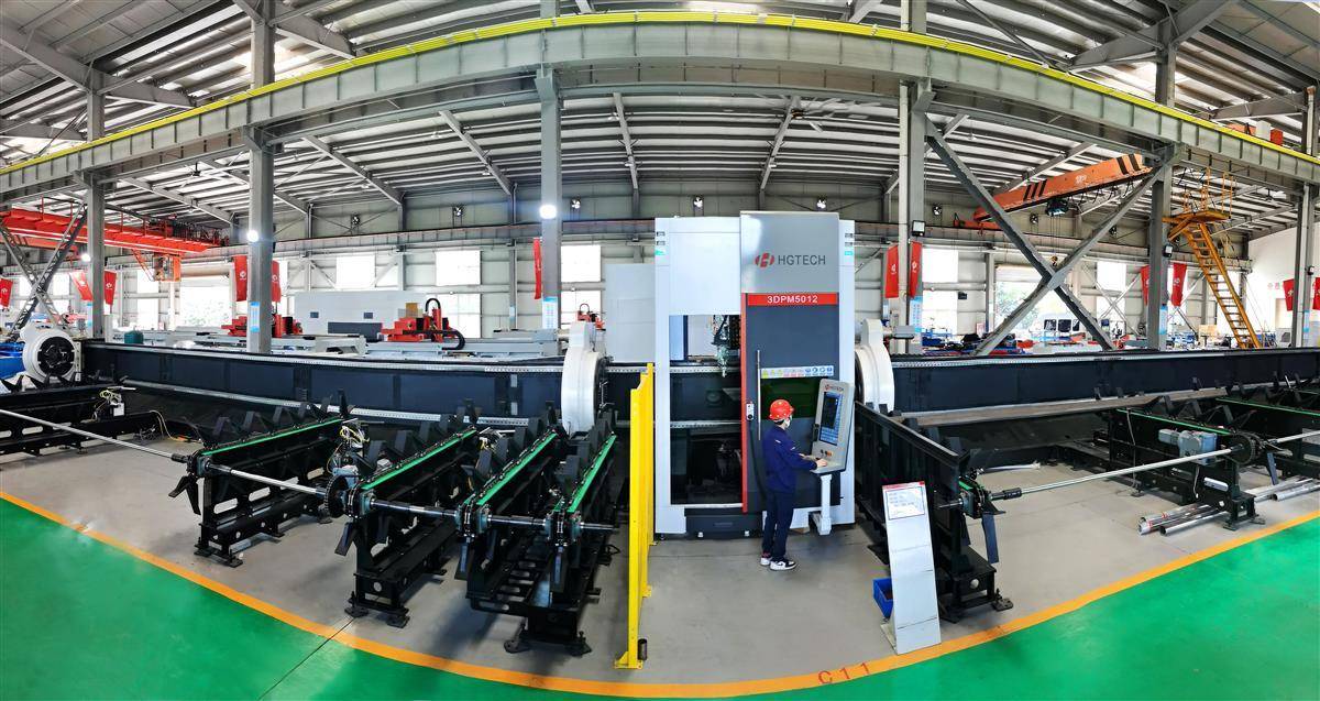 華工激光總經理鄧家科介紹,它的最大加工管徑為0.5米,最大加工長度12米,單根管材最大載重2.7噸,通過全自動激光切割,可以實現送料、切割、搬出高度自動化,解決了超大、超重、超長管材在加工中工序繁瑣、轉運困難、耗時費力等痛點,“用一套設備替代了過去的一座工廠。”