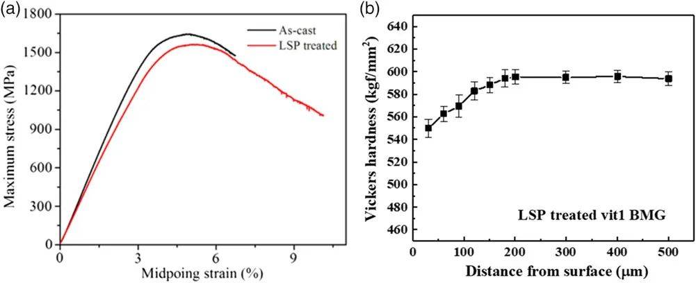 圖33 a)鑄態和經LSP處理的Vit1 BMG的三點彎曲法向應力和中點應變曲線;b)經LSP處理的Vit1 BMG截面上的顯微硬度值。
