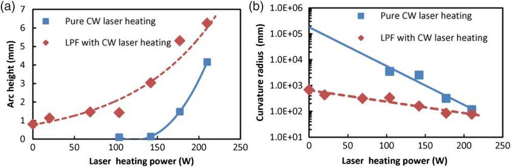 根據對前兩種彎曲機制的觀察,可以推斷,當薄板非常薄時,通常只能通過LPF獲得凹曲率。為了在薄板中產生凸曲率,提出了一種稱為飛秒LPF(FLPF)的方法。在該工藝中使用的低能激光可以減少殘余壓應力的深度,并且當選擇適當的參數時,可以獲得凸曲率。此外,當使用飛秒激光作為能量源時,不需要使用保護層和約束層。這簡化了流程,提高了效率。