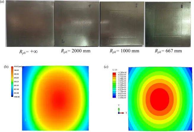 實驗和模型預測的變形形狀:(a)不同預彎條件下形成的試樣;(b)預彎曲半徑667mm下的實驗輪廓;(c)在667mm預彎曲半徑下的模型預測輪廓。