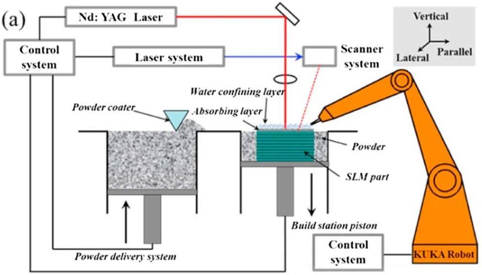 然而,由于激光沖擊波的影響深度有限,LSP的積極影響僅存在于上表面層,無法消除樣品內部累積的殘余拉伸應力。因此,提出了3D LSP(3D LSP)的概念,這是一種將SLM與LSP集成在一起的新型混合AM工藝。也就是說,在SLM過程中,在沉積幾層金屬粉末后引入LSP處理,并且SLM繼續在LSP處理層上進行。之后,再次引入LSP來處理新沉積的層。這個循環一直持續到沉積完成。集成SLM-LSP系統的示意圖如圖27所示。通過將LSP集成到SLM工藝中,樣品內部有害的拉伸殘余應力可以轉化為壓縮殘余應力,部件的疲勞性能可以進一步提高。