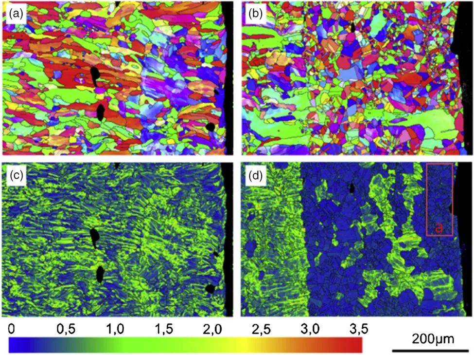 圖29 SLM AB和SLM LSP樣品在1100℃熱處理10 min后的EBSD圖:a) SLM AB樣品的反極圖,b) SLM LSP樣品的EBSD圖。c) SLM AB樣本的局部錯位圖和d) SLM LSP樣本。