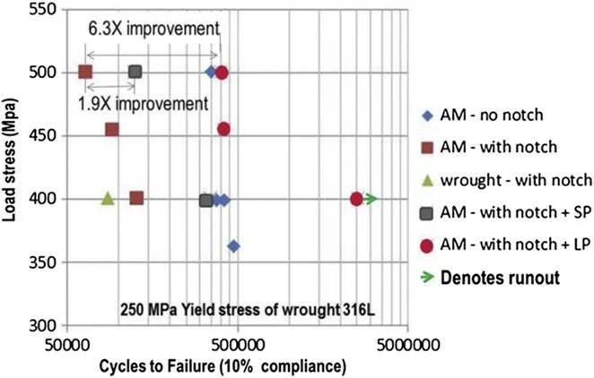 圖26 AM 316L不銹鋼的疲勞壽命試驗結果與應力載荷對比,比較了無缺口AM樣品與未著色、噴丸和激光噴丸材料的缺口。