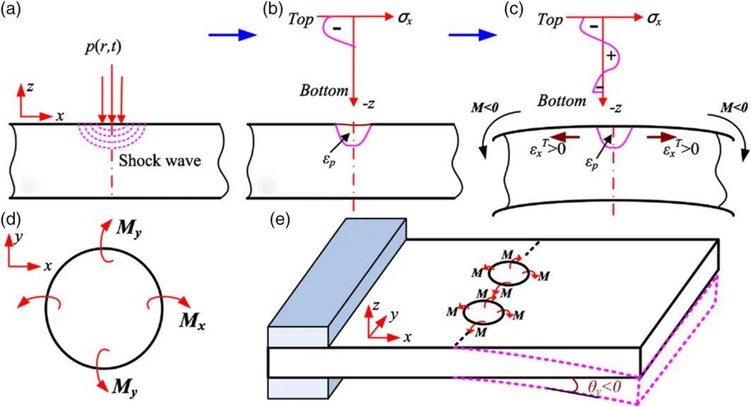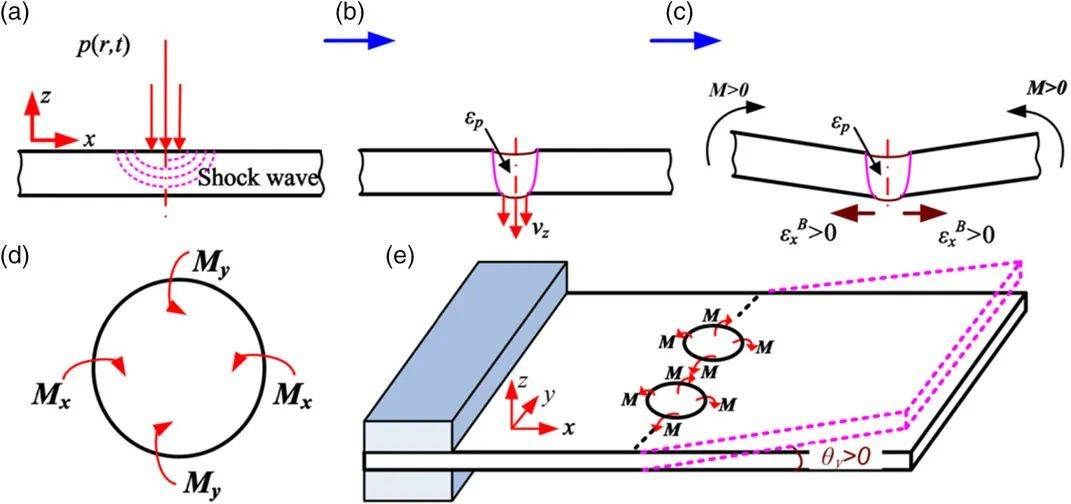 圖24 通過沖擊彎曲機構進行LPF彎曲的工藝步驟:a)激光沖擊加載,b)向下移動和塑性變形,c)沖擊彎曲,d)單元上的彎曲力矩,以及e)一端固定的金屬板彎曲。
