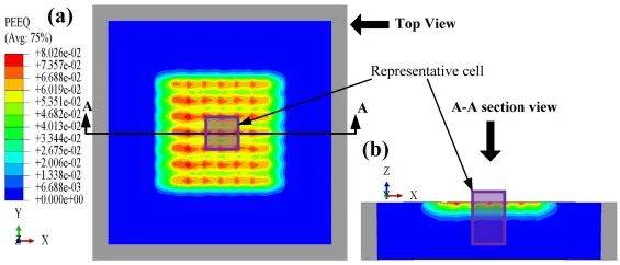 預彎曲半徑為667 mm的顯式無限平板模型的等效塑性應變場輪廓:(a)頂面塑性應變場,(b) x軸截面深度塑性應變場。