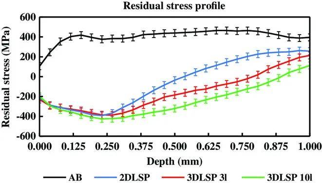 圖28 Ti6Al4V樣品在AB、2D LSP、3D LSP 3 l和3D LSP 10 l條件下的殘余應力分布。注:“AB”為SLM AB條件下的樣品,“2D LSP”為在頂面上僅經過最終LSP處理的樣品(與傳統LSP相同),“3D LSP”為實際生產的樣品,如圖27所示。3D LSP處理后的樣本結果分為“3D LSP 3l”和“3D LSP 10l”,表示兩個LSP處理層之間的層數。