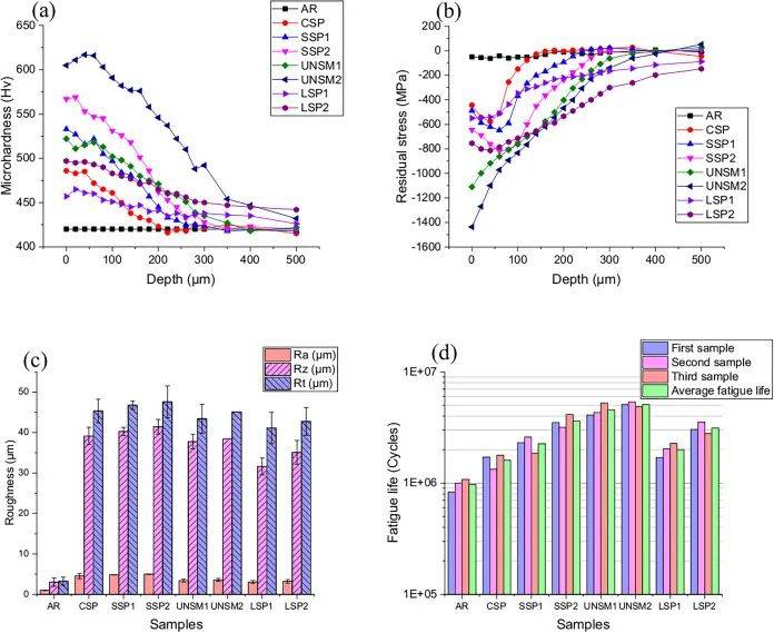 圖5 獲得了(a)顯微硬度剖面(b)壓縮殘余應力分布(c)表面粗糙度參數(shù)和(d)900 MPa最大應力下的疲勞壽命的結(jié)果。