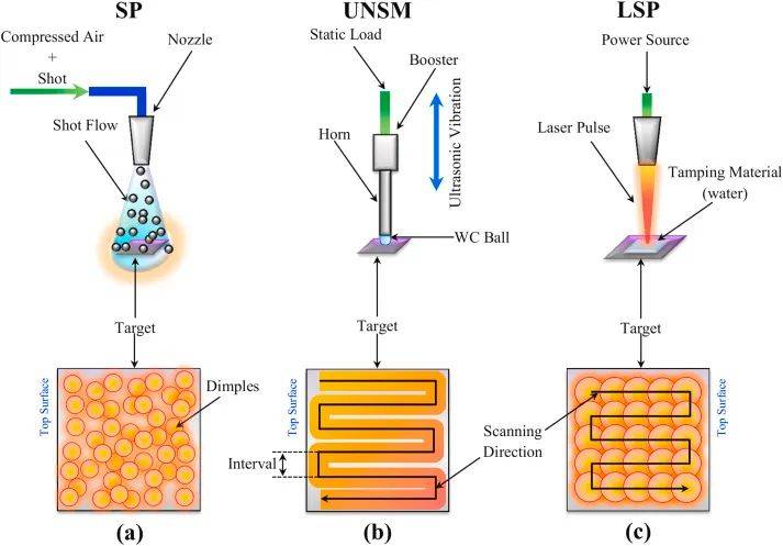 上述三種技術(shù)均通過表面塑性變形誘導表面晶粒細化和殘余壓應力;然而,它們的影響程度不同,并且隨著感興趣的材料而不同。