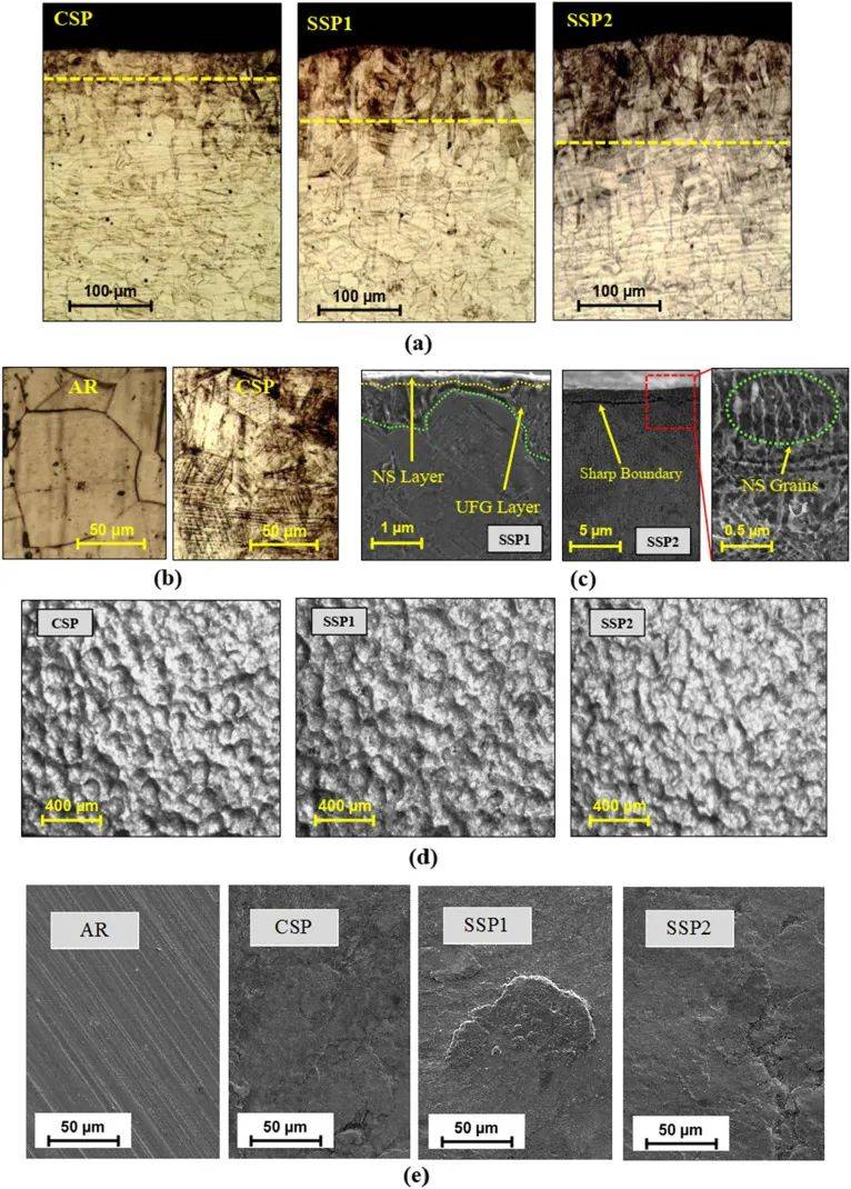 (a)處理樣本的橫截面OM圖像。(b) AR和CSP樣品的典型微觀結(jié)構(gòu)。(c) SSP1和SSP2嚴重噴丸樣品的FESEM觀察。(d) OM和(e)FESEM分別顯示了噴丸試樣的表面形貌。
