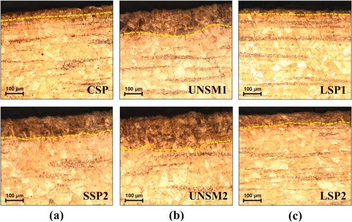 圖3 處理樣本的橫截面OM顯微照片:(a)SP,(c)UNSM和(c)LSP。與底行樣本相比,頂行圖像對應于每個處理使用較低動能處理的樣本。