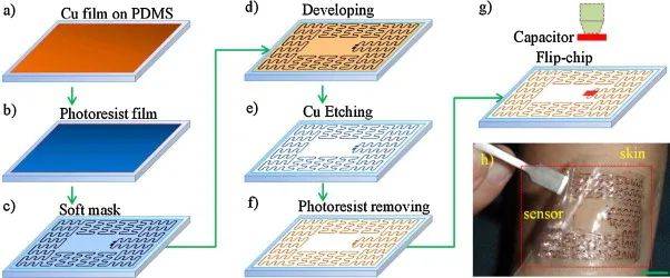 分形無線線圈(一種電LC諧振電路)的濕法蝕刻制造工藝如上圖所示。關(guān)鍵步驟如下。(a)一個銅膜~10μm的厚度被粘合到~200μm厚的PDMS基板。(b)銅表面旋涂厚度小于2μm的光刻膠。(c)使用具有自相似無線線圈圖案的軟掩膜來控制紫外線(UV)的穿透。將光刻膠系統(tǒng)上的掩模在紫外線下移入曝光機,曝光約5–10分鐘。(d)將帶有光刻膠的可拉伸基板放入顯影粉末溶液(20 g/2 l),無紫外線照射的光刻膠將消失。圖案被轉(zhuǎn)移到光刻膠膜上。(e)將顯影后的銅膜放入刻蝕劑溶液(50g/200ml)中約15min,用刻蝕劑溶液刻蝕無光刻膠膜保護的銅,形成具有自相似結(jié)構(gòu)的分形線圈結(jié)構(gòu)膜。(f)光致抗蝕劑膜模具將通過丙酮溶液從銅線圈中釋放,并清潔分形銅線圈。(g)所選容量的Cs采用倒裝芯片工藝安裝在無線線圈上。各向異性導(dǎo)電膜用于將電容和無線線圈連接在一起。可拉伸無線線圈可以通過施加到PDMS基板端部的外力來拉伸。制造的自相似無線線圈安裝在皮膚上,如圖h所示。它可以通過與矢量網(wǎng)絡(luò)分析儀相連的外部無線線圈來監(jiān)測皮膚的應(yīng)變。