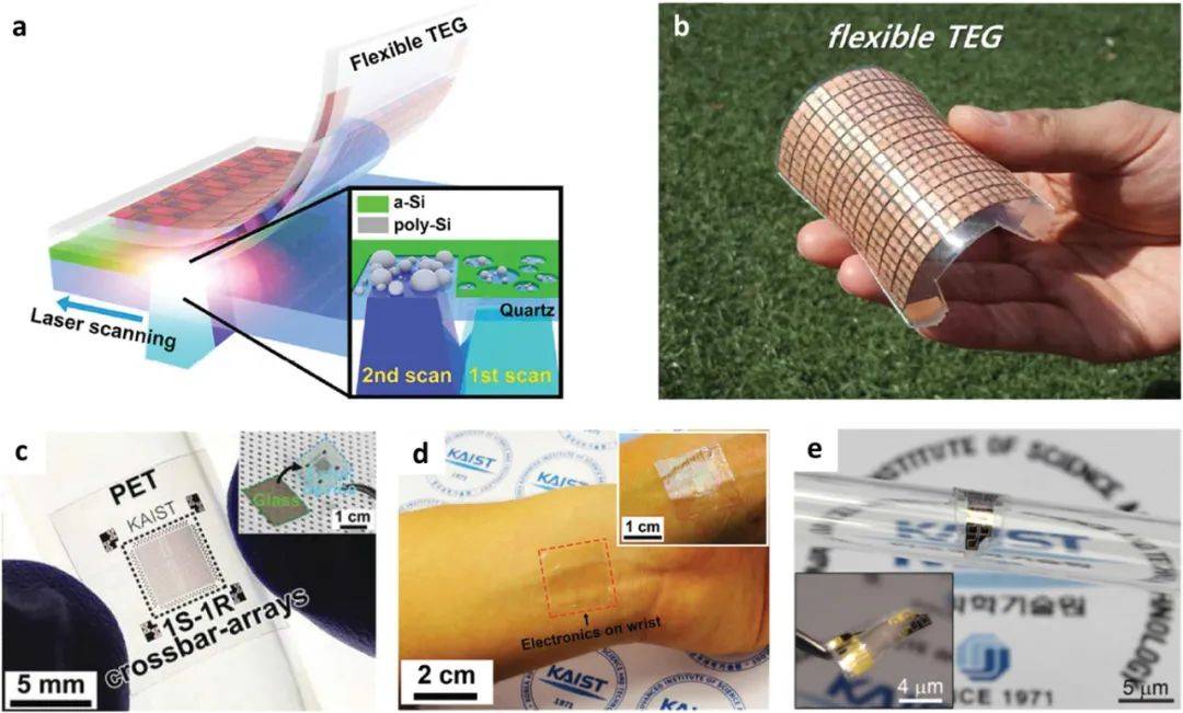 剩余襯底上隨機生成的硅納米結(jié)構(gòu)被認(rèn)為通過減小接觸面積來削弱緩沖氧化層和透明襯底之間的粘附。因此,較差的附著力使得整個裝置能夠從透明基板上分離,而不會造成任何損壞。然而,非常高的工藝溫度(超過500°C)將導(dǎo)致a-Si:H層脫水。缺乏氫來加速分離將導(dǎo)致分層過程中的失效。為了克服這一局限性,提出了一種稱為激光多掃描(LMS)去角質(zhì)工藝的先進技術(shù)。使用準(zhǔn)分子激光多次暴露于脫水非晶硅(a-Si)層也可以降低剝離層和透明襯底之間的粘附力。在第一次曝光時,僅隨機生成了少量的硅納米顆粒和微尺度孔洞。額外的激光掃描將非晶硅層完全轉(zhuǎn)變?yōu)樵S多硅納米顆粒(圖9e,f)。這種方法允許使用更高的工藝溫度(超過700°C)進行器件制造。采用絲網(wǎng)打印技術(shù)(SPT)和LMS工藝制造了高性能柔性熱電動力源(f-TEG)(圖10a,b)。700℃以上的退火工藝證明,該工藝可與SPT-700℃以上的應(yīng)用相兼容。這兩個過程的結(jié)合可以為大面積應(yīng)用提供更高的成本效益和更好的可擴展性。