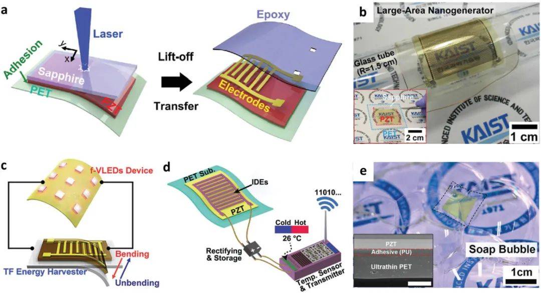 圖8 a) LLO制造高效柔性PZT基NG的工藝示意圖。b)在半徑為1.5cm的彎曲玻璃管上制作了大面積PZT基NG(3.5cm×3.5cm)。c)由LLO基NGs產(chǎn)生的電力運行的自供電柔性發(fā)光系統(tǒng)示意圖。d)由基于LLO的NGs產(chǎn)生的電力運行的自供電無線傳感器節(jié)點示意圖。e)漂浮在肥皂泡上的超薄柔性基板上的PZT薄膜照片(插圖比例尺=5μm)。