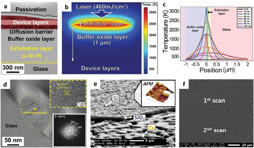 圖9 a) LLO工藝前整體結(jié)構(gòu)的SEM圖像,包括剝離層、緩沖氧化層、器件層和鈍化層。b) 460mj cm?2激光輻照下結(jié)構(gòu)熱分布的有限元模擬準(zhǔn)分子激光器。c)作為整體結(jié)構(gòu)尺寸函數(shù)的計算溫度分布;觀察到溫度的快速變化。d)在玻璃襯底上形成的硅納米結(jié)構(gòu)的TEM分析結(jié)果。e) LMS剝離過程后f-TEG表面的傾斜SEM圖像。插圖顯示了緩沖氧化層上硅丘的AFM映射結(jié)果。f)在紫外激光照射一次(圖像的上側(cè))和兩次(圖像的下側(cè))后,石英襯底上非晶硅層的SEM圖像。