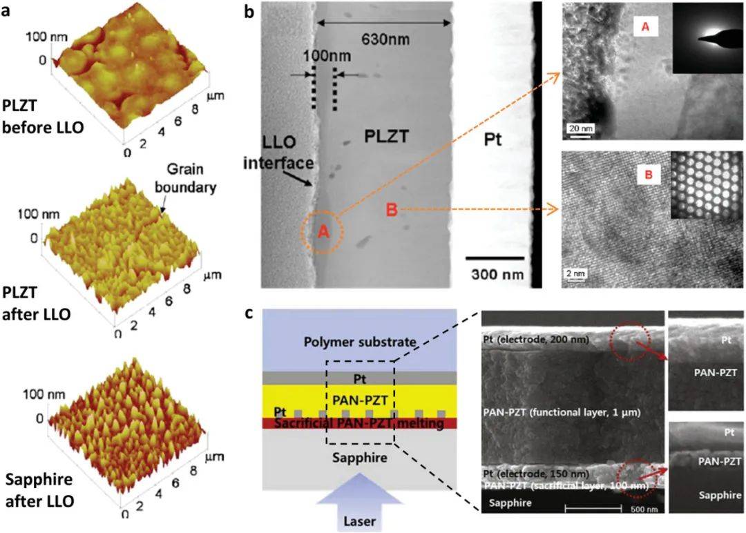 圖7 a) LLO前后PLZT和藍寶石表面的AFM顯微照片。LLO后,兩個表面都顯示出粗糙和扭曲的特征。b) PLZT薄膜經(jīng)LLO處理后的橫截面TEM圖像;區(qū)域A和區(qū)域B的高倍圖像分別顯示了非晶和晶相。c)基于PAN-PZT犧牲層的柔性器件的示意圖和橫截面SEM圖像。