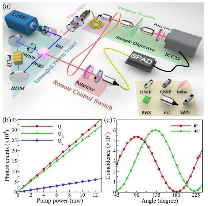 圖1.(a)量子暗場顯微成像實驗裝置圖。(b)不同泵浦功率下信號端(紅線)、預示端(綠線)和兩者之間的符合(藍線)光子計數。(c)符合光子計數和偏振角之間的關系。