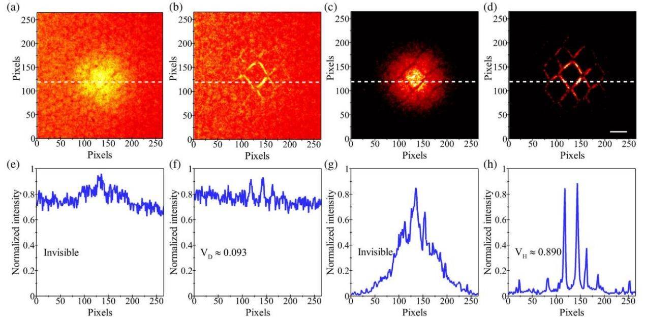 圖2.透明生物細胞的量子顯微成像結果。(a)和(b)內部觸發ICCD的直接明場像和直接暗場像。(c)和(d)由單光子觸發的量子明場像和暗場像。(e)-(h)分別沿(a)-(d)中的白色虛線提取的強度分布。
