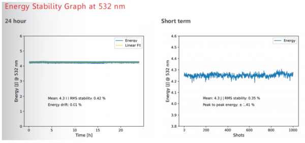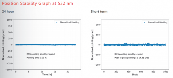 解讀:對于像泵浦鈦寶石這樣需要用長焦聚焦鏡把泵浦光能量聚焦于鈦寶石晶體之中的應用,包括其他希望光斑在工作面的抖動越小越好的應用來說,指向穩定性都是一項非常重要的指標,這塊受YAG激光器增益原理和光學設計的限制,很難進一步大幅提升,普遍就是±50μrad的指標;SpitLight HD這次將其提升到遠小于30μrad,且是(24h)長效穩定,是很厲害的,走在世界前列。