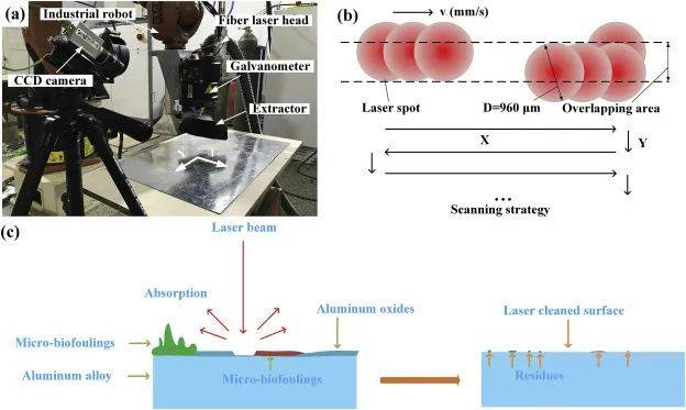 圖5(a)所用激光清洗系統(tǒng)的照片和(b)激光清洗掃描路徑的示意圖(c)激光清洗鋁合金表面天然海洋微生物污垢的示意圖。
