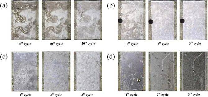 圖6顯示了不同激光注量和清潔周期下激光清潔表面的宏觀圖像。在激光清洗過程中,由于微生物污垢內的水蒸發(fā),感覺到強烈的海洋氣味。這是納秒脈沖激光與某些海洋生物相互作用的結果。如圖6(a)所示,在第20次清潔循環(huán)后仍存在一些殘留痕跡。這表明這種較低的激光影響可以逐層去除生物膜,但效率較低。近年來,利用納秒激光制備不同結構功能表面的研究得到了廣泛的研究。微觀尺度形態(tài)特征主要包括平行線凹槽、網(wǎng)格、斑點模式和簇狀花狀微結構。在這項工作中,應用激光束既可以清理附著有海洋微生物污垢的臟表面,也可以對鋁合金基底進行微加工。
